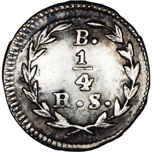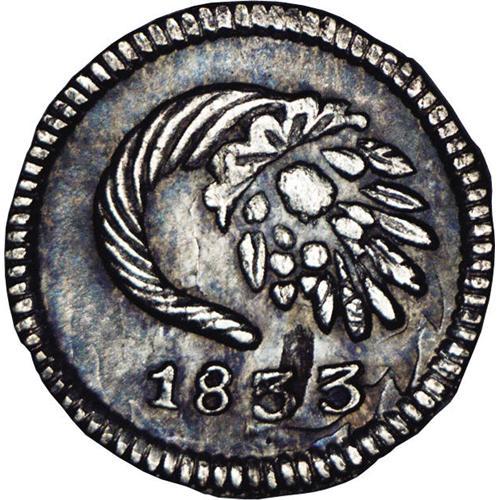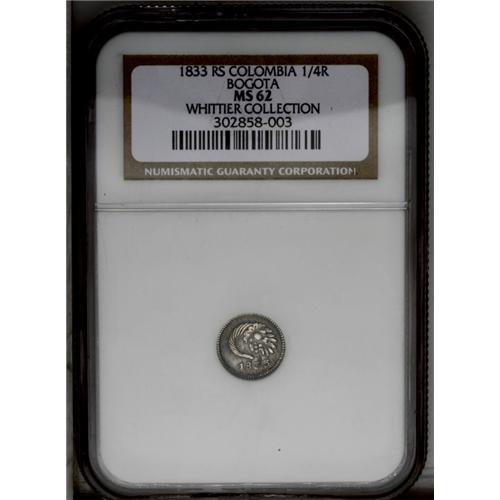 <B>Republic 1/4 Real 1833-RS Bogota, </B></I>KM85.2, MS62 NGC, remarkably well-defined details, medium gray patina and a light planchet lamination by the first 3 in the date. Very rare quality, ex-Ponterio Sale 94, Lot 1626.