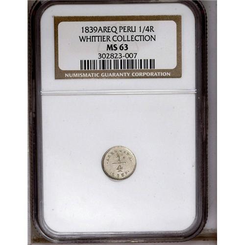 <B>Republic 1/4 Real 1839 Arequipa, </B></I>KM143.2, MS63 NGC, an incredible example of this rarity with razor sharp details and full prooflike mint brilliance. Unquestionably the finest known of this elusive one-year type coin.
