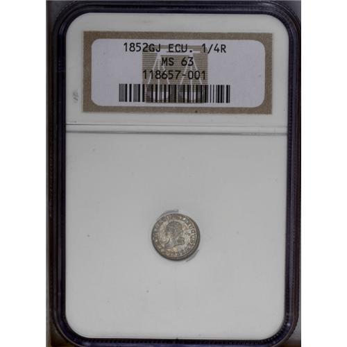 <B>Republic 1/4 Real 1852-GJ, </B></I>KM36, MS63 NGC, an appealing coin with boldly defined details and gray-gold patina. Very scarce in this quality.