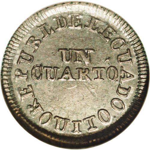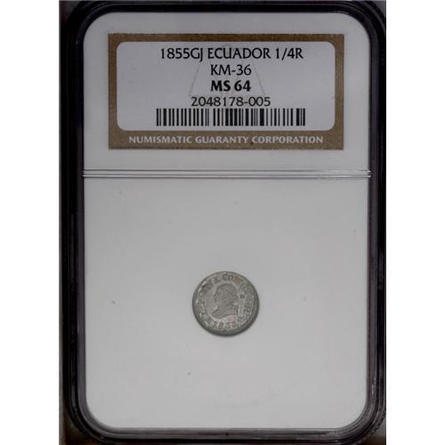 <B>Republic 1/4 Real 1855-GJ, </B></I>KM36, MS64 NGC, lightly toned with full underlying mint luster, rare in this desirable condition.