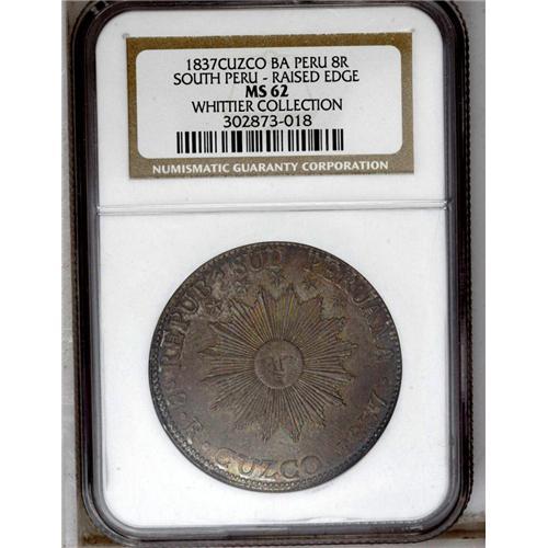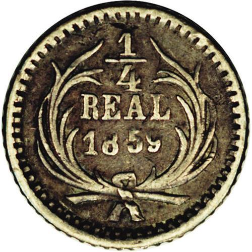 <B>Republic 1/4 Real 1859, </B></I>KM130, XF40 NGC, lightly toned, extremely rare date, especially in this grade and without the expected damage such as hole or mount mark. One of the keys to entire Latin cuartilla series.