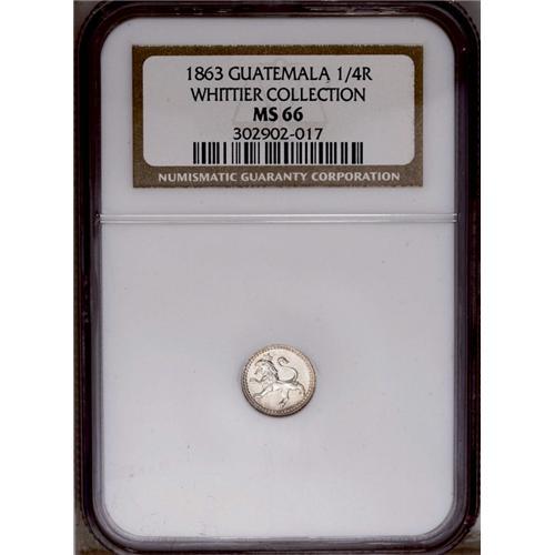 <B>Republic 1/4 Real 1863, </B></I>KM130, MS66 NGC, a virtually perfect coin with full intense mint luster, rare grade for this underrated date.
