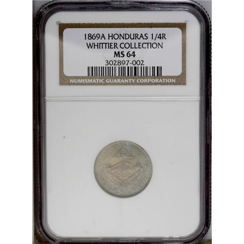 Republic 1/4 Real 1869A, KM31, MS64 NGC, fully lustrous Republic 1/4 Real 1869A,