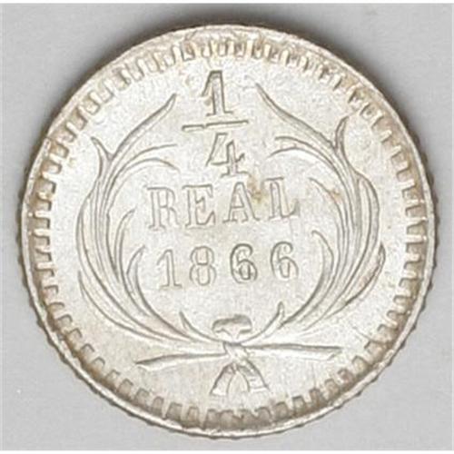 <B>Republic 1/4 Real - Two Dates, </B></I>KM130, 1864, toned VF, scarce date, and 1866, choice brilliant UNC.