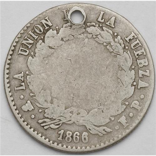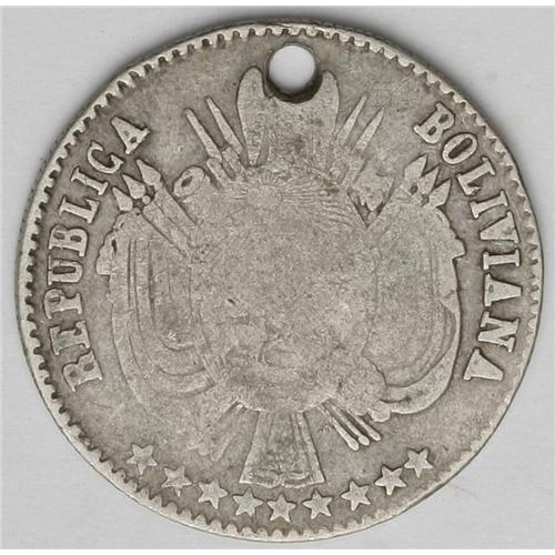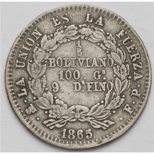 <B>Republic 1/5 Boliviano - Two Dates, </B></I>KM151.2, stars closer together, 1865-FP, F-VF, and 1866-FP, holed VG.