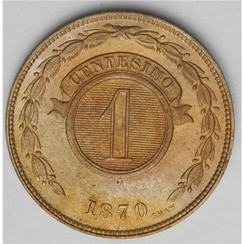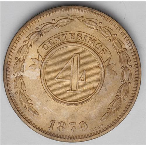 <B>Republic 1870 Copper Trio, </B></I>KM2, 3 and 4.1, the 1, 2 and 4 Centesimos struck at the Heaton Mint in Birmingham, England. When the Mint Archives Collection was sold, a number of choice first strikes of these types were included. This particular trio is very attractive with full mint red and no noticeable spots.