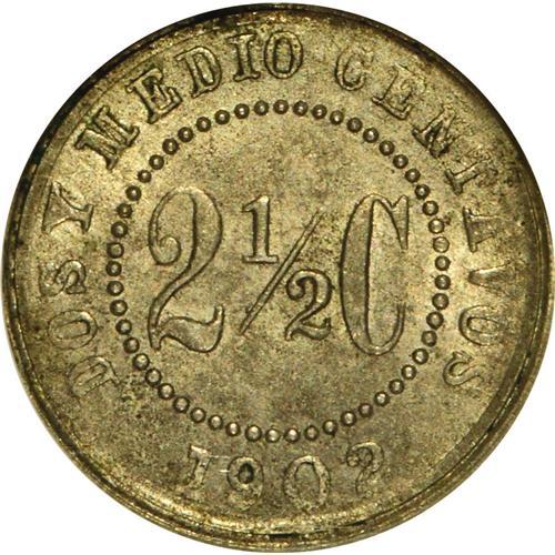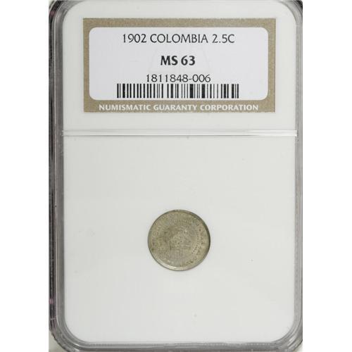 <B>Republic 2 1/2 Centavos 1902, </B></I>KM190, MS63 NGC, medium gray toning, rare date struck at the Waterbury Mint.<BR><BR><b>Shipping:</b> Coin/Currency (<a target="_blank" href="http://www.heritageauctions.com/common/shipping.php">view shipping information</a>)