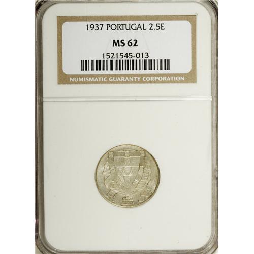 <B>Republic 2 1/2 Escudos 1937, </B></I>KM580, MS62 NGC, fully lustrous with one tiny spot, very rare grade for this key date.<BR><BR><b>Shipping:</b> Coin/Currency (<a target="_blank" href="http://www.heritageauctions.com/common/shipping.php">view shipping information</a>)