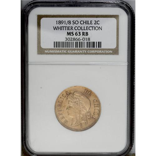 <B>Republic 2 Centavos 1891 Overdate 1/8, </B></I>KM147a, MS63 NGC Red & Brown, lightly cleaned at one time and a tiny scratch on the reverse, a very rare date and overdate. Several coinage specifications took place in the 1891 Chilean series, and the mintage for the 2 Centavos is noticeably low. Very few have ever appeared in the market in any grade!