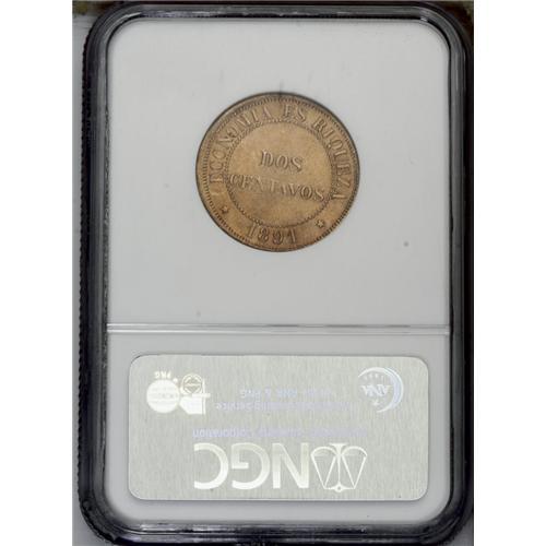 Republic 2 Centavos 1891 Overdate 1/8, KM147a, MS63 NGC Republic 2 Centavos 1891 Overdate 1/8,