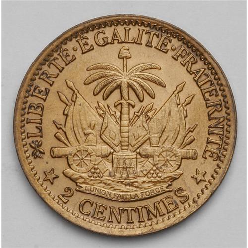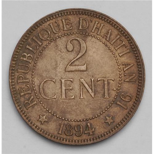 <B>Republic 2 Centimes - Two Types, </B></I>KM43 1881, lustrous UNC, lightly dipped and now toning, and KM49 1894A, cleaned UNC, no longer lustrous. <B>Sold as is, no return lot.</B></I>