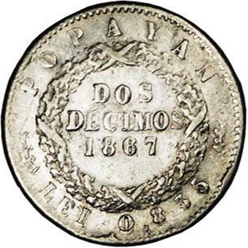 Republic 2 Decimos 1867 Popayan, KM149a.2, AU55 NGC, cr Republic 2 Decimos 1867 Popayan,