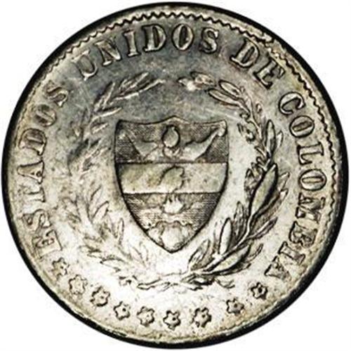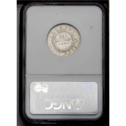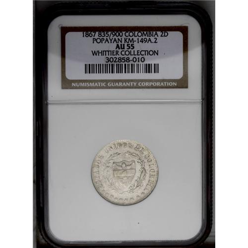 <B>Republic 2 Decimos 1867 Popayan, </B></I>KM149a.2, AU55 NGC, crudely manufactured but with very little actual circulation wear, elusive one-year type with 835 punched over 900 (fineness.)