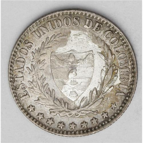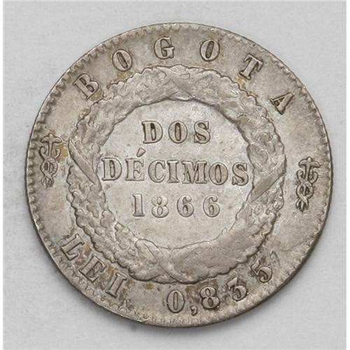 <B>Republic 2 Decimos - Two Types, </B></I>KM149, 1865 Bogota, toned nearly Fine, very scarce one-year type, and KM149a.1, 1866 Bogota, toned XF, scarce quality.