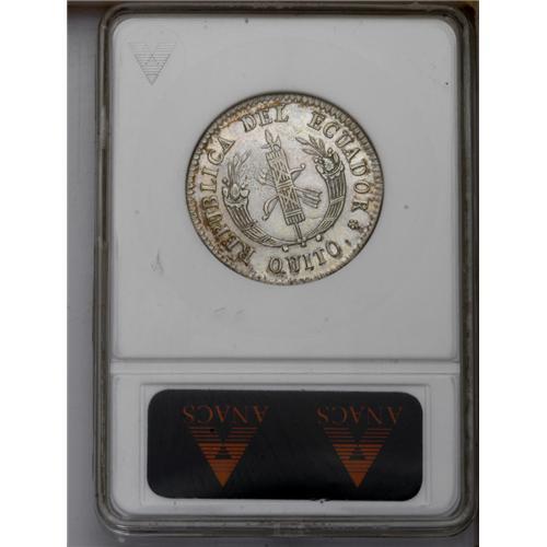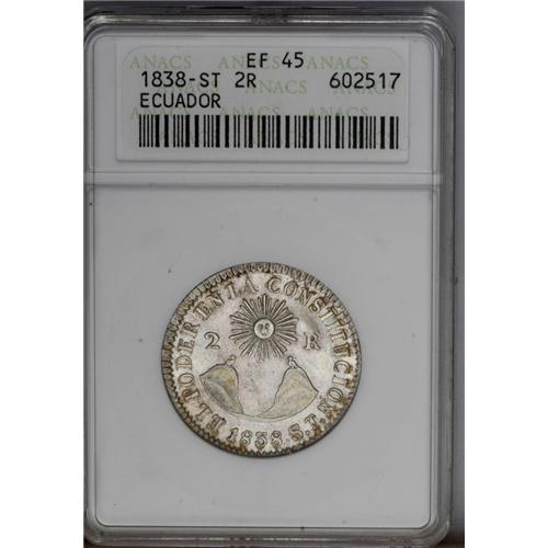 <B>Republic 2 Reales 1838-ST, </B></I>KM18, regular legend positions, XF45 ANACS, very sharp details including the textured hillsides with some original mint luster in the legends. Very scarce date/assayer and quality.