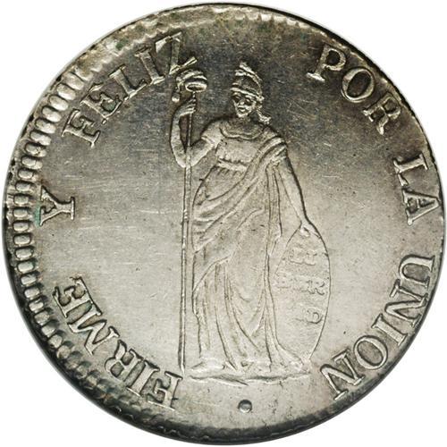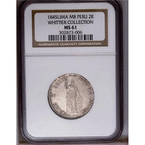 <B>Republic 2 Reales 1845-MB Lima, </B></I>KM141.3, MS61 NGC, a nice coin with bold details and abundant mint luster. Very scarce date and grade.