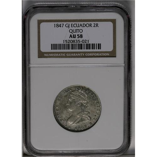Republic 2 Reales 1847-GJ, KM33, AU58 NGC, lightly tone