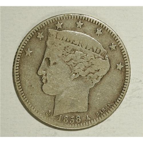 <B>Republic 2 Reales 1858A, </B></I>KM-Y10, Fine, evenly worn and quite attractive for the grade. Scarce one-year type.<BR><BR><b>Shipping:</b> Coin/Currency (<a target="_blank" href="http://www.heritageauctions.com/common/shipping.php">view shipping information</a>)