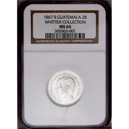 <B>Republic 2 Reales 1867R, </B></I>KM142, MS64 NGC, extremely attractive with full frosty white mint brilliance, rare in this quality.