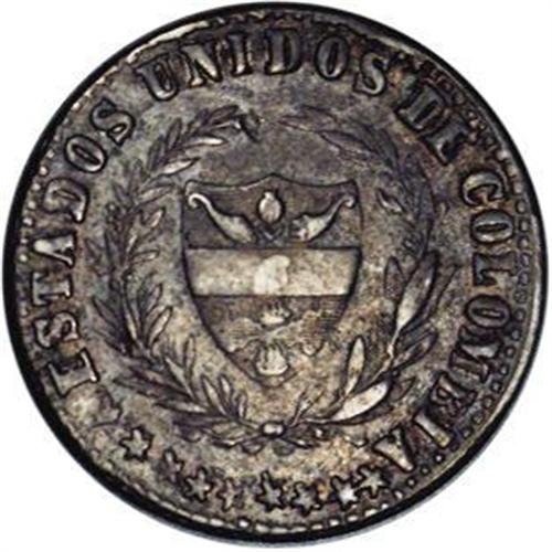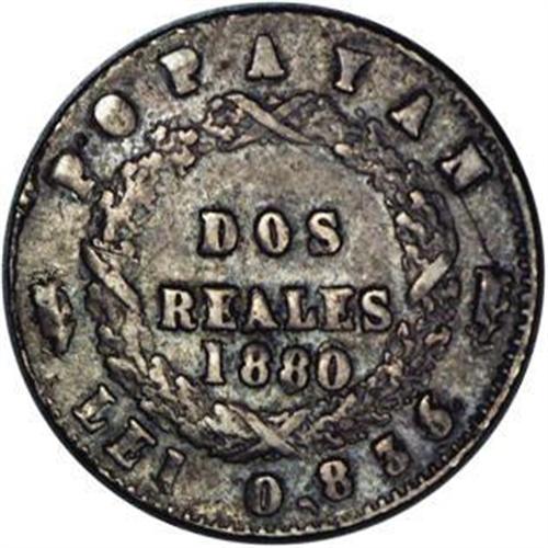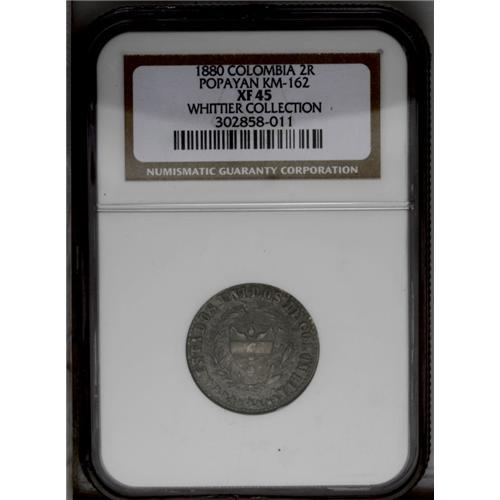 <B>Republic 2 Reales 1880 Popayan, </B></I>KM162, XF45 NGC, toned with unusually strong details, rare type produced from heavily recut 2 Decimos dies.