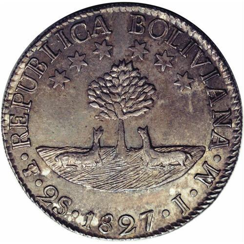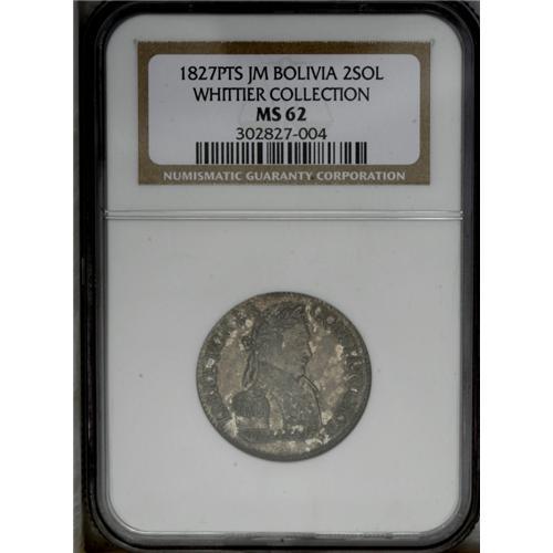 Republic 2 Soles 1827-JM, KM95, MS62 NGC, well-struck a Republic 2 Soles 1827-JM,