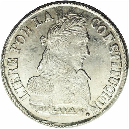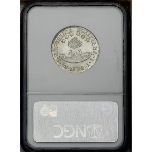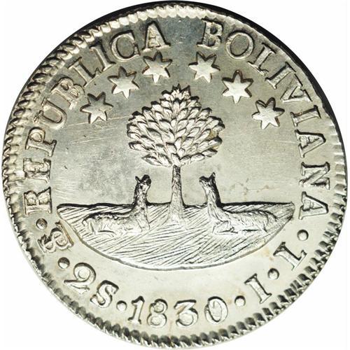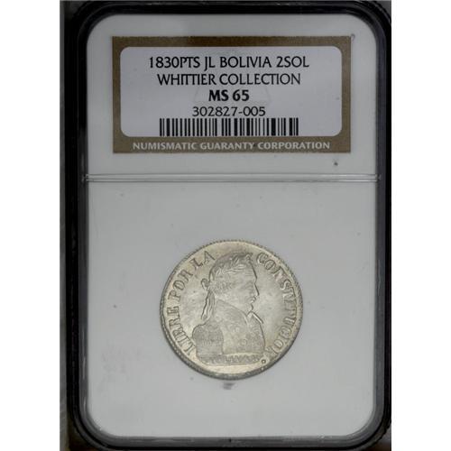 <B>Republic 2 Soles 1830-JL, </B></I>KM95a, MS65 NGC, an incredibly bold example with full mint bloom, well deserving of the grade assigned by NGC. Very rare in this quality and it would be difficult to believe that a finer specimen could exist. The assayer for this date should be J, JF or JL, but the letters on this coin are clearly IL!