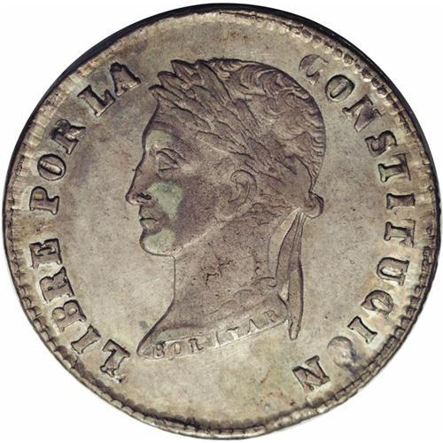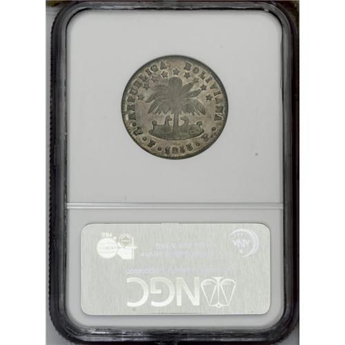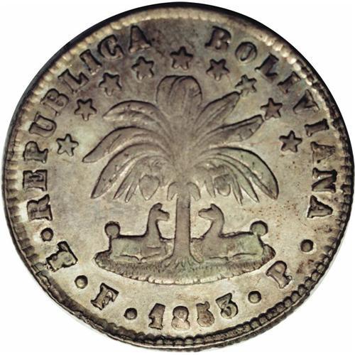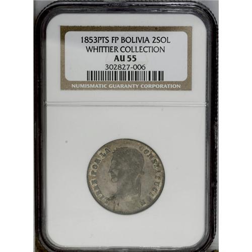 <B>Republic 2 Soles 1853-FP, </B></I>KM121.1, AU55 NGC, moderately toned with flashes of luster in the legends. First type without the denomination, rare grade.