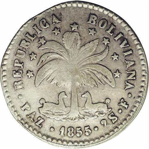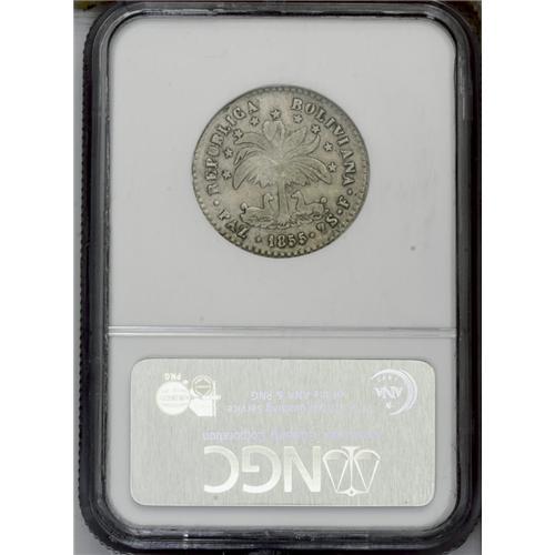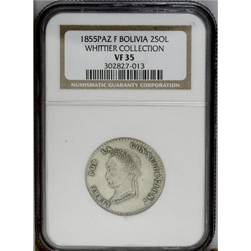 <B>Republic 2 Soles 1855-F Paz, </B></I>KM129, VF35 NGC, extremely rare date and grade, none reported finer. An appealing example with even wear and clearly defined details on the bust.