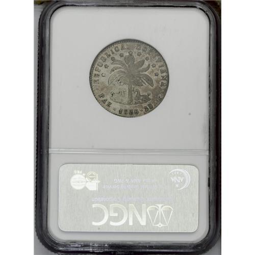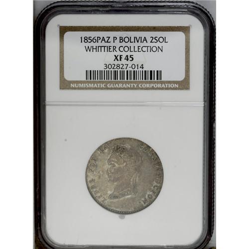 <B>Republic 2 Soles 1856-P Paz, </B></I>KM129, XF45 NGC, a nicely toned coin with flashes of underlying luster. Very rare date and type.