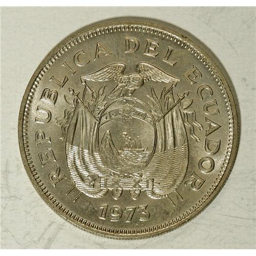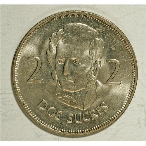 <B>Republic 2 Sucres 1973, </B></I>KM82, nice brilliant UNC. Although 2 million pieces were originally struck, all but approximately 35 pieces were melted and the type was never released to circulation. A very elusive modern type.<BR><BR><b>Shipping:</b> Coin/Currency (<a target="_blank" href="http://www.heritageauctions.com/common/shipping.php">view shipping information</a>)