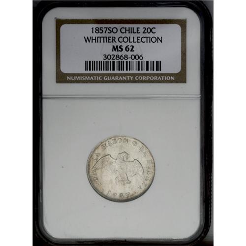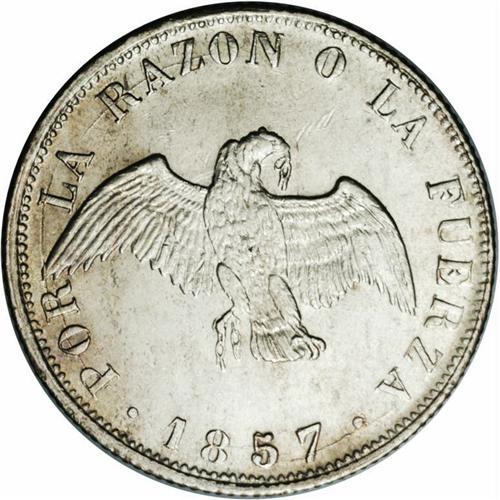 Republic 20 Centavos 1857, KM125, MS62 NGC, virtually f Republic 20 Centavos 1857,