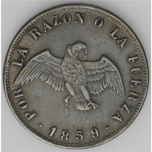 <B>Republic 20 Centavos 1859/8, </B></I>KM125, toned VF-XF, nice details on the condor, very scarce date.