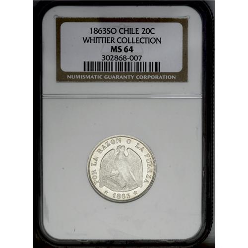 <B>Republic 20 Centavos 1863, </B></I>KM135, MS64 NGC, a superb example with brilliant mint luster, somewhat prooflike in the legends, and tremendous overall eye appeal - certainly a first strike of this scarce first date of the large condor design.