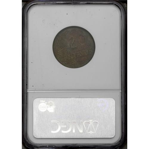 <B>Republic 20 Centavos 1943, </B></I>KM215a.1, MS63 NGC, deeply toned with very sharp details, scarce grade for this World War II brass issue.