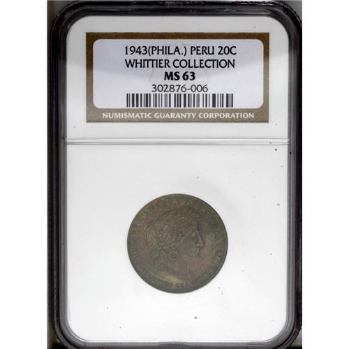Republic 20 Centavos 1943, KM215a.1, MS63 NGC, deeply t Republic 20 Centavos 1943,