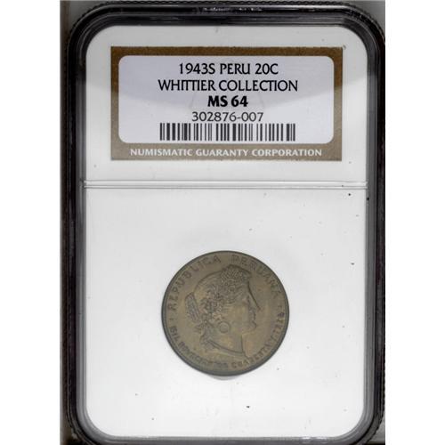 <B>Republic 20 Centavos 1943S, </B></I>KM215a.2, MS64 NGC, a choice example with medium toning and full underlying mint luster. Rare grade for this date.