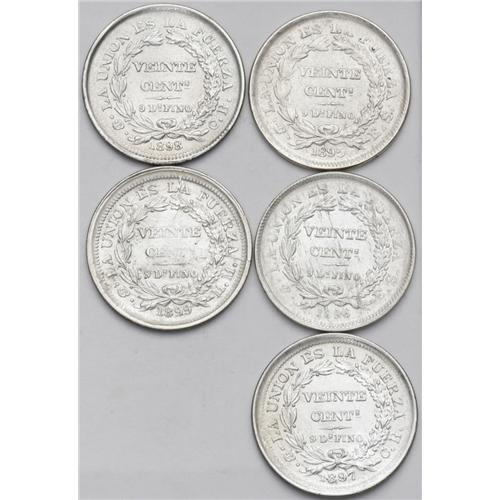 <B>Republic 20 Centavos Date Assortment, </B></I>KM159.2 1895-ES, lustrous AU, soft strike, 1896-ES, AU, 1897-CB, UNC, 1898-CB, XF+, very scarce date, and 1899-MM, AU-UNC. <B>Sold as is, no return lot.</B></I>