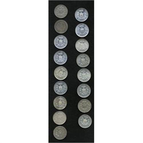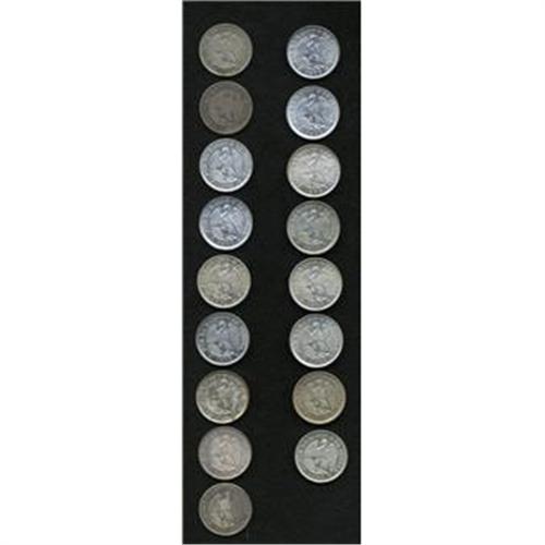 <B>Republic 20 Centavos Date Collection, </B></I>seventeen different dates including: KM138.1 1867, VF, 1868, VG/F, 1869, XF, 1870, BU, 1871, UNC, 1872, AU, 1873, XF-AU, 1874, AU, 1875, VF, 1876, BU, 1877, AU and 1878, choice BU, KM138.2 1879, AU-UNC, 1880/79, choice UNC, 1881, BU and KM138.4 1892, repunched S in Cents, nice AU and 1893, BU. <B>Sold as is, no return lot.</B></I>