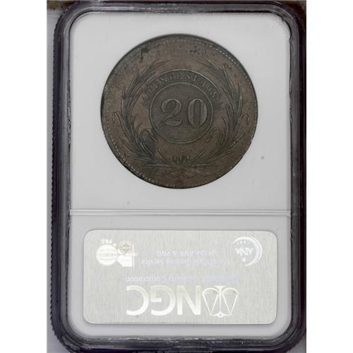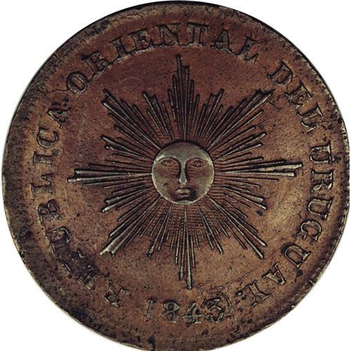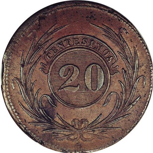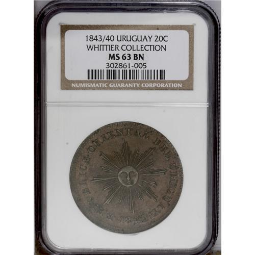 <B>Republic 20 Centesimos 1843/0, </B></I>KM2.2, MS63 NGC Brown, a fabulous example of this crude coinage with remarkably bold details and a lovely brown sheen to the surfaces. Very rare in this delightful quality.