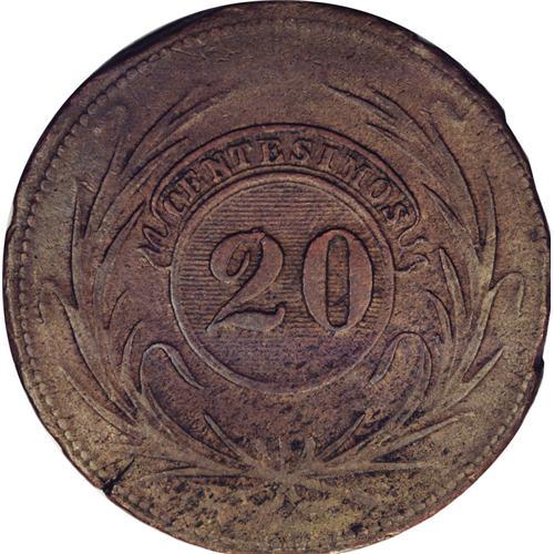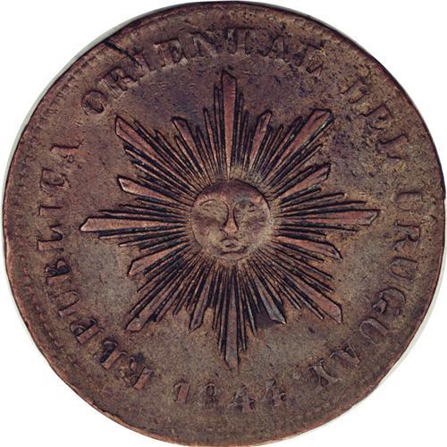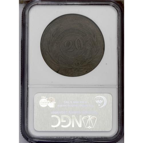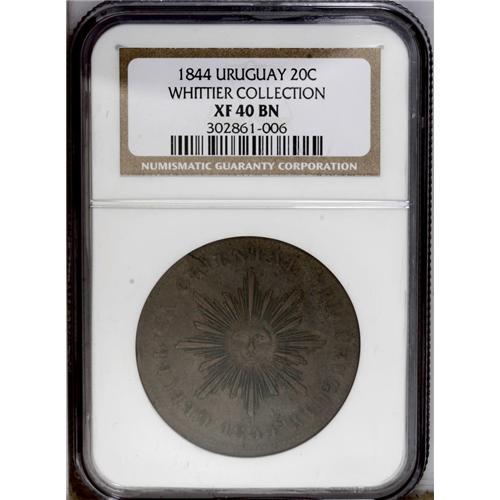 <B>Republic 20 Centesimos 1844, </B></I>KM2.2, XF40 NGC Brown, a very nice example with some gloss to the surfaces, bold details and no planchet flaws beyond a tiny edge crack. Very scarce grade for this crude and fascinating coinage.