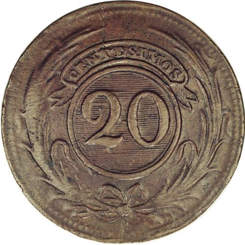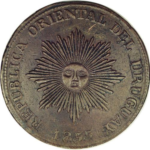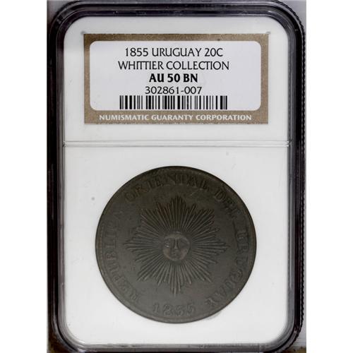 <B>Republic 20 Centesimos 1855, </B></I>KM7, AU50 NGC Brown, a second choice example of this date with glossy brown surfaces and no flan flaws. Very attractive and rare in this pleasing quality.
