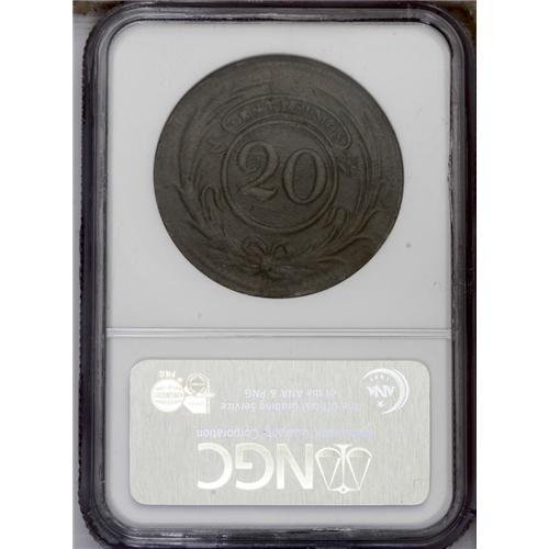 Republic 20 Centesimos 1855, KM7, AU50 NGC Brown, a sec Republic 20 Centesimos 1855,