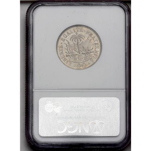 <B>Republic 20 Centimes 1907, </B></I>KM55, MS64 NGC, fully prooflike with extremely sharp details, either a Proof or an early first strike. Very attractive.