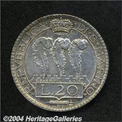<B>Republic 20 Lire 1938R, </B></I>KM11a, UNC, attractive gold and gray toning. Rare and popular key date to this series. <BR><BR><B>Important notice:</B> Heritage usually auctions material at the rate of 200-250 lots per hour. On some occasions eBay Live bid software or the Internet may not be able to keep up with the pace of the auction. We recommend placing a realistic absentee bid now as insurance to avoid disappointment. Occasionally the auctioneer may eliminate or reject an eBay Live bid, and the auctioneer may also reopen a lot after the close of the eBay live bidding (usually because we missed an audience bid), and may reject your bid even if it shows you as the winning bidder. By bidding via eBay Live, you agree that Heritage may award the lot to another bidder at its sole discretion under the circumstances described above or any other reasonable circumstances. Since eBay bids are not shown to us until we open the lot on the floor, we treat those bids just like floor bids. In most cases the floor responds before the eBay bid is presented to us, due to Internet lag time, so for consistency we have made it a policy that floor bids are always considered first over tie eBay live bids. Also please note that all Heritage lots purchased through eBay Live carry a 20% Buyer's Premium. Please make sure you read the Terms and Conditions before you bid.