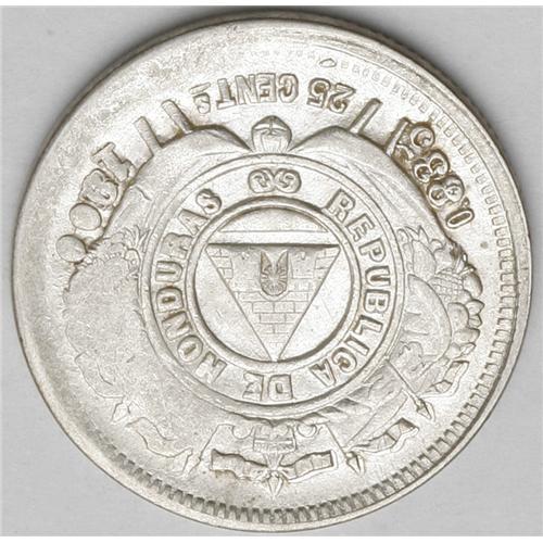 <B>Republic 25 Centavos - Two Dates, </B></I>KM50a 1899/33, toned AVF, very attractive example, and 1900/886, choice AU, abundant mint luster. Both of these coins show the reduced fineness 0.835 clearly punched over 0.900.