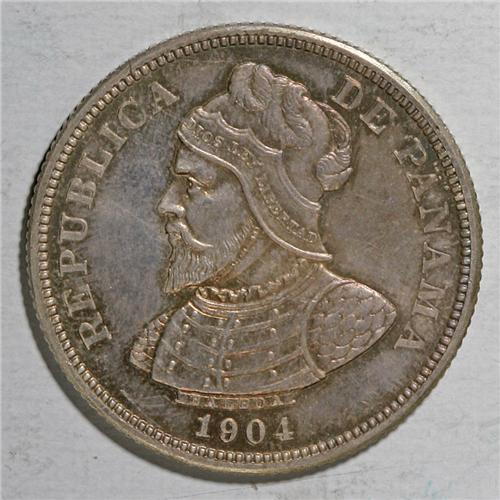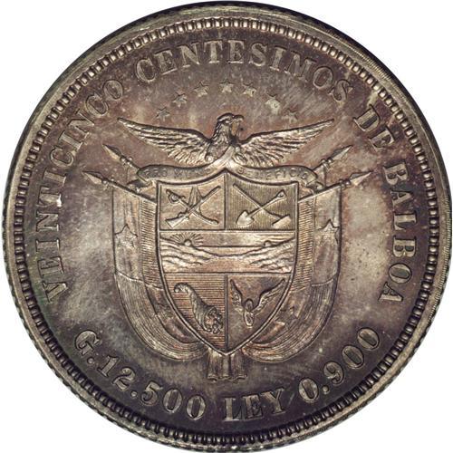 <B>Republic 25 Centesimos 1904, </B></I>KM4, gem Proof with lilac and gray patina, extremely attractive. There are a couple of faint hairlines in the left obverse field and one rim flaw at 6 o'clock on the reverse. Very rare with a mere 12 pieces minted. The edge has been slightly shaved at the mint, possibly to remove excess metal or weight. It is not immediately noticeable and detracts little from this amazing rarity. <BR><I>From the Louis E. Eliasberg, Sr. Collection</B></I><BR><BR><b>Shipping:</b> Coin/Currency (<a target="_blank" href="http://www.heritageauctions.com/common/shipping.php">view shipping information</a>) <BR><BR><B>Important notice: