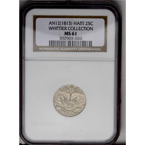 <B>Republic 25 Centimes An 12 (1815), </B></I>KM12.2, MS61 NGC, smaller diameter type, very attractive with considerable original mint brilliance. Scarce date and grade.