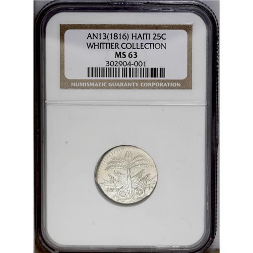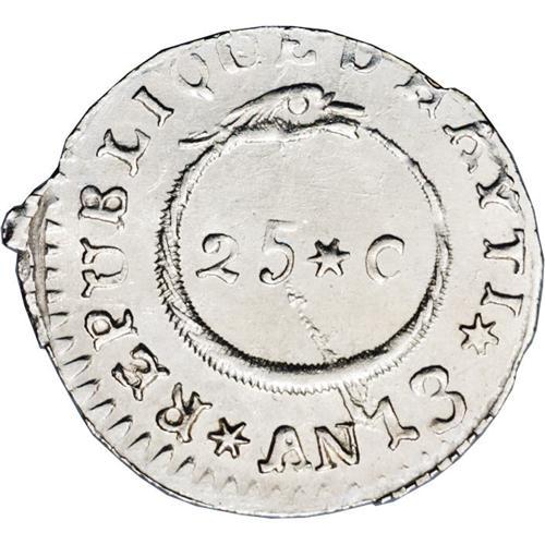 <B>Republic 25 Centimes An 13 (1816), </B></I>KM12.2, MS63 NGC, very bold design details, lustrous surfaces but probably cleaned at one time. Very scarce grade for this early series.