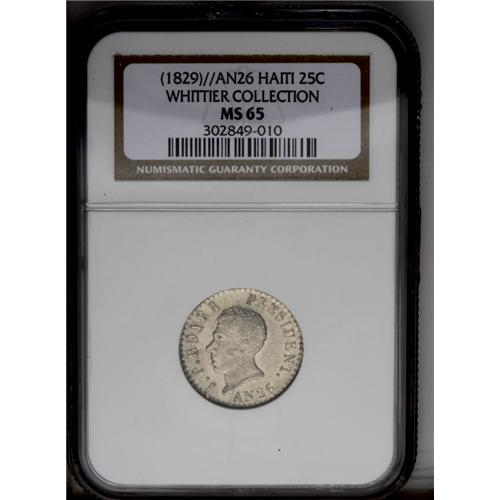 <B>Republic 25 Centimes An 26 (1829), </B></I>KM18, MS65 NGC, a wonderful coin with full mint brilliance, light gold patina and incredibly bold design details. Very rare condition for this elusive date.