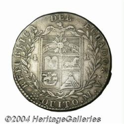 Republic. 4 Reales 1844MV-A, KM27, VF, a choice example of this rare type with bold details on both sides, but especially nice on the bust of Bolivar, including the hair details. The 8 Ds in the obverse fields is completely readable, which is rarely the case. Additionally, this example has a very attractive light color with just a trace of toning in the legends and coat of arms. There are some very light scratches in the coat of arms which are not distracting at all, and not readily evident to the naked eye.From the Morris Geiger Collection. Important notice: Heritage usually auctions material at the rate of 200-250 lots per hour. On some occasions eBay Live bid software or the Internet may not be able to keep up with the pace of the auction. We recommend placing a realistic absentee bid now as insurance to avoid disappointment. Occasionally the auctioneer may eliminate or reject an eBay Live bid, and the auctioneer may also reopen a lot after the close of the eBay live bidding (usually because we missed an audience bid), and may reject your bid even if it shows you as the winning bidder. By bidding via eBay Live, you agree that Heritage may award the lot to another bidder at its sole discretion under the circumstances described above or any other reasonable circumstances. Also please note that all Heritage lots purchased through eBay Live carry a 20% Buyer's Premium. Please make sure you read the Terms and Conditions before you bid.